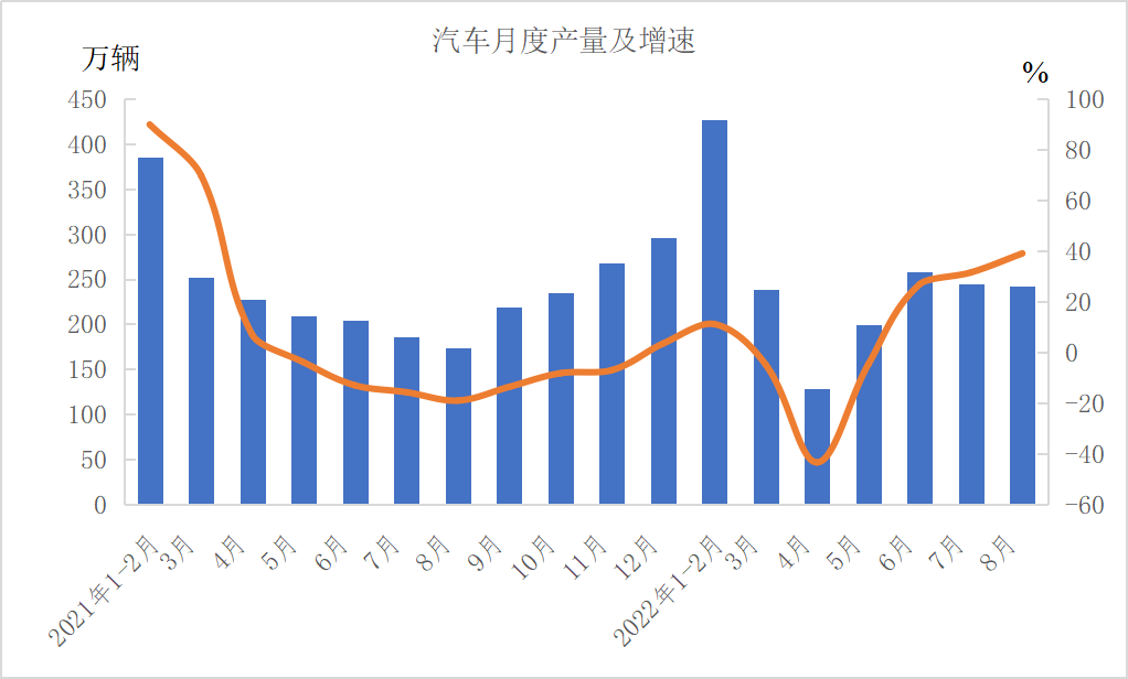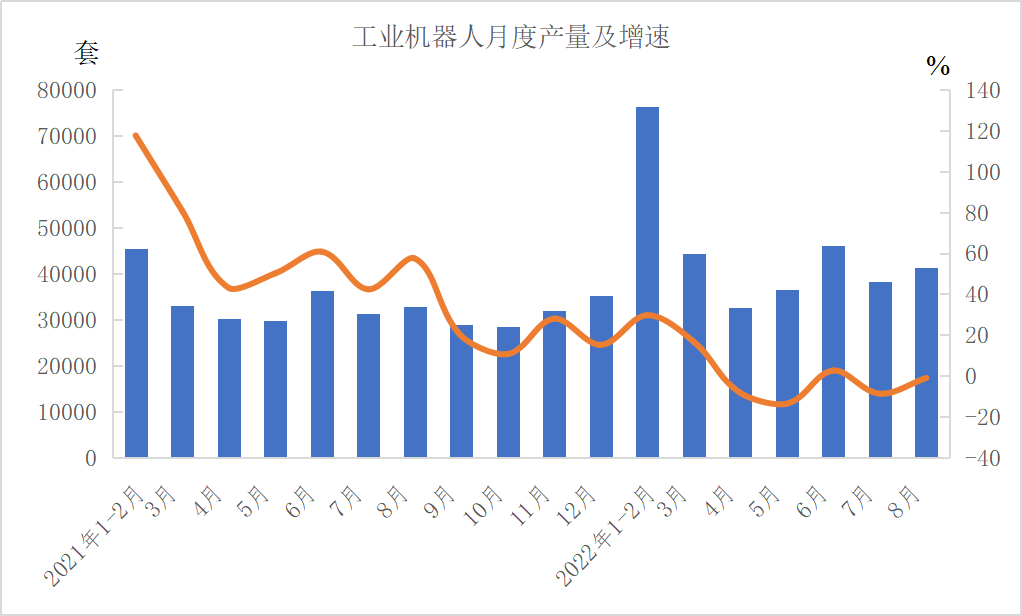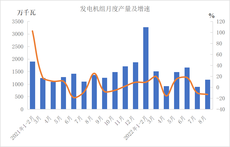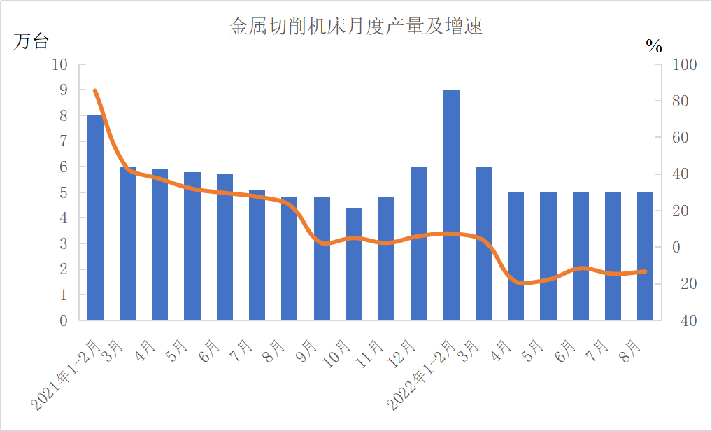 分产品看,1—8月份,金属切削机床38万台,下降10.5%;工业机器人智能化277536套,下降10.5%;汽车1735.8万辆,增长6.1%,其中新能源汽车407.4万辆,增长110.1%;发电机组(发电设备)9602万千瓦,增长2.8%。