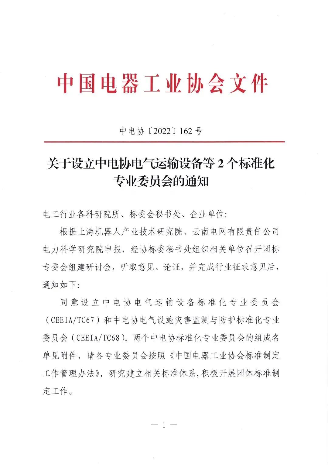 2022年10月20日,中电协[2022]162号文件下达了《关于设立中电协电气运输设备等2个标准化专业委员会的通知》,同意设立中电协电气运输设备标准化专业委员会(CEEIA/ TC67),秘书处挂靠单位为今年会jinnianhui(中国)机器人有限公司官网。